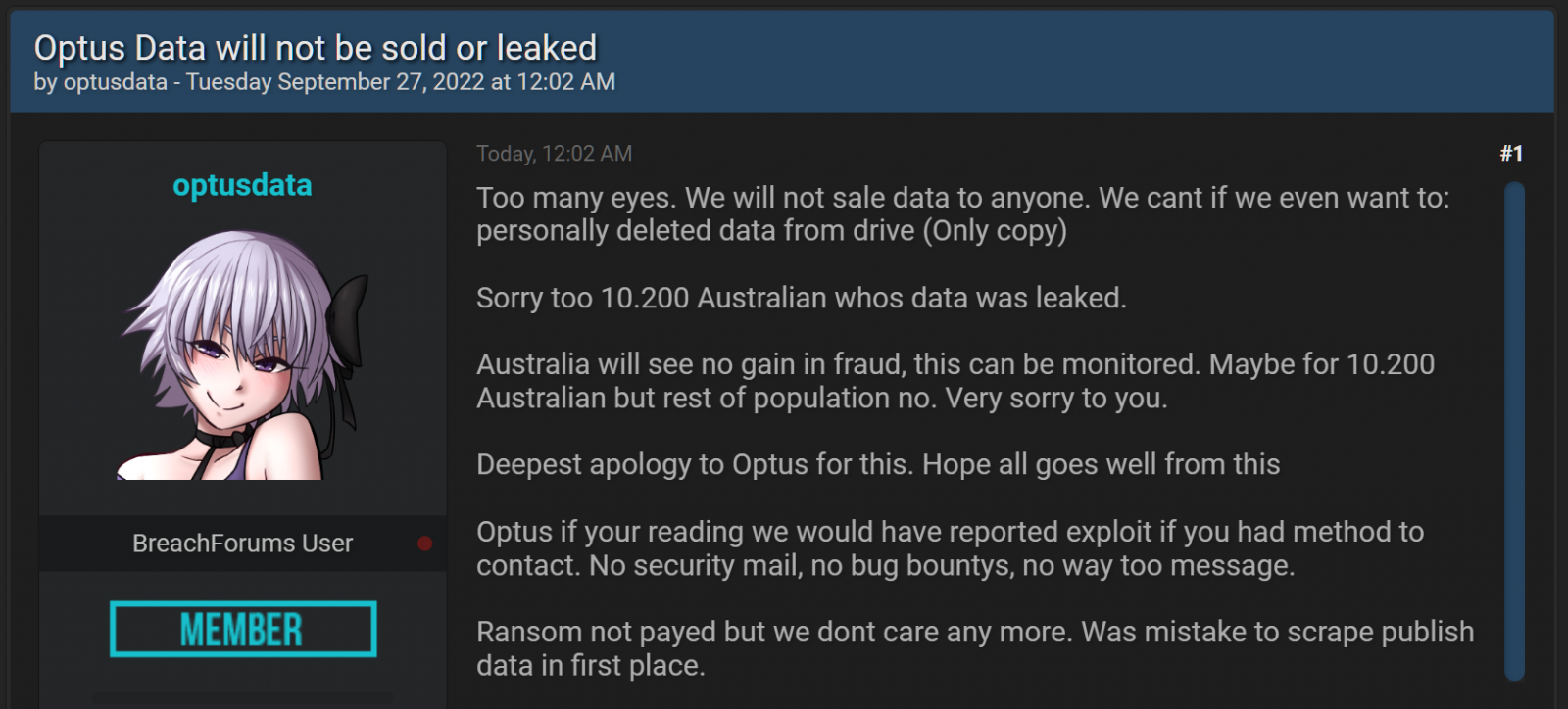On the 27th of September, the threatactor released 10,200 customer identities, stating to upload another 10,000 customer identities every day until the ransom is paid. During this time, the AFP (Australian Federal Police) ensured individuals that multiple government agencies including the FBI (‘Federal Bureau of Investigation’ based in the US) have gotten involved to secure, determine and prosecute the hacker involved and have taken every measure to act and protect the Optus customers affected by the hack. The number of agencies was later confirmed by Optus in an apology video uploaded days later stating that governments and over 20 licensing agencies were involved in the investigation.
